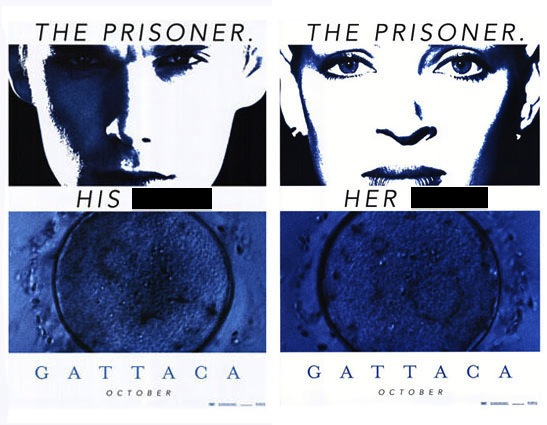 Ați primit posterul filmului Gattaca, un film despre un viitor în care codul genetic uman a fost complet descifrat. Aceasta permitea practic instantaneu să afli orice despre altă persoană - durata probabilă de viață, predispozițiile pentru boli, caracteristicile înnăscute a personalității, cele mai recomandate specialități, etc. Din această cauză oamenilor le devine tot mai greu să-și depășească condiția - din copilărie genele povestesc despre ei totul, ce pot și ce nu pot. Anume cu referire la aceasta, pe poster este scris: His X. Her X. Scrieți, ce am înlocuit cu X, în română sau în engleză.